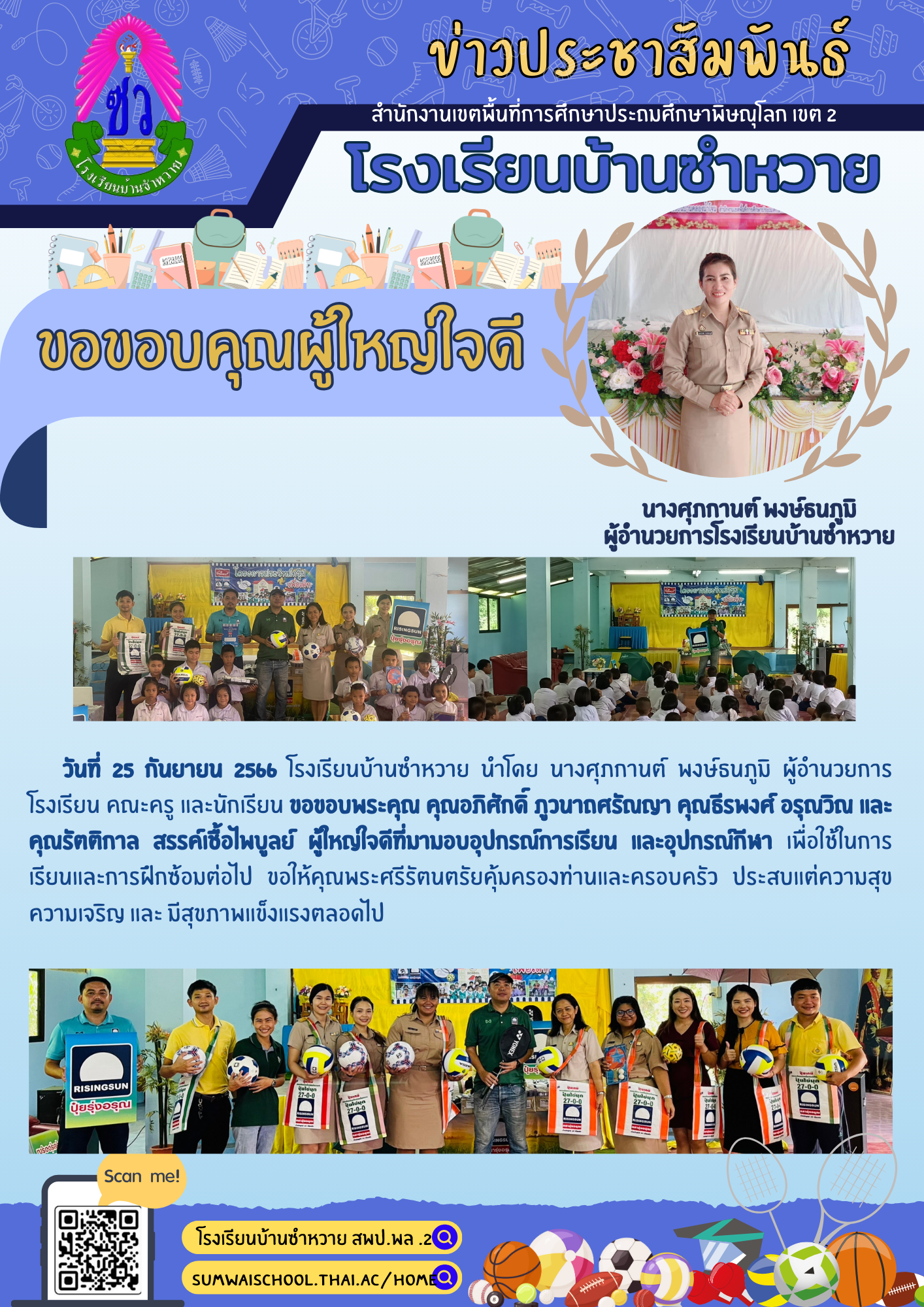 ขอขอบคุณร้านปุ๋ยรุ่งอรุณมอบอุปกรณ์กีฬาและอุปกรณ์การเรียน